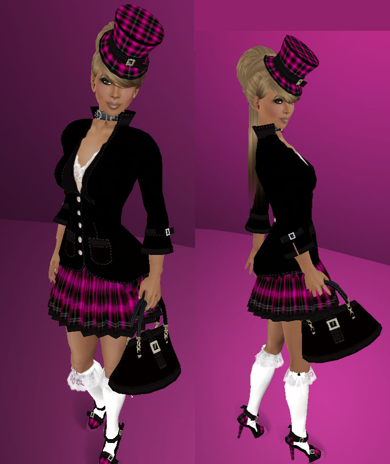 This look is new from talented Nyla Cheeky for her ready to wear line. It is the coco haute sexy schoolgirl. Nyla plays with textures in this polished sexy schoolgirl look. The package has the whole look, including two jackets one with and one without blouse, a flexi pleated skirt with sit scripts, knee high lace socks come with sit script in the lace frill as well. The hat, mary jane buckled pumps and handbag are all included. Shoes come with and without sound. Available in 8 colours , 1500 L.
